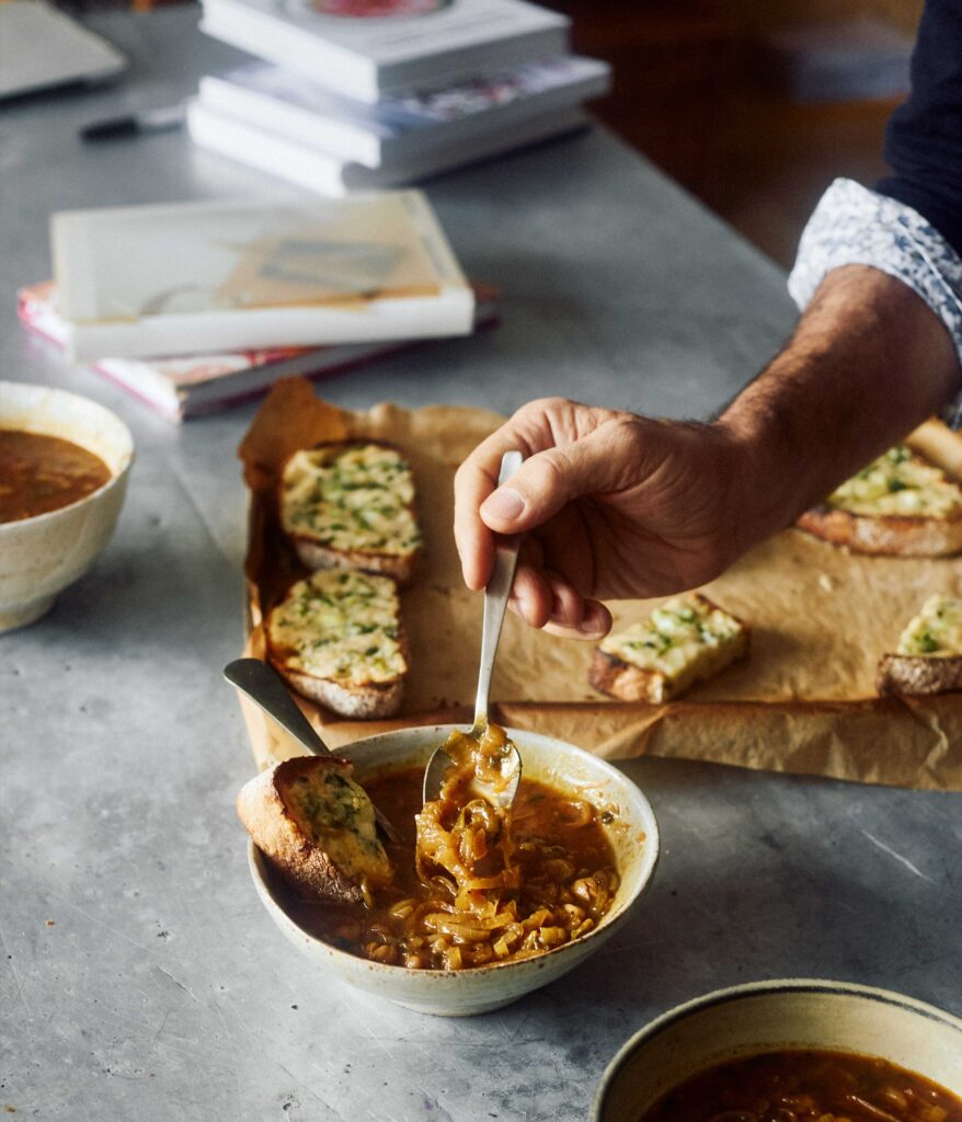 Consider this a French onion soup with an Ottolenghi twist, with the addition of chickpeas, coriander, cumin, cloves, cardamom and fenugreek adding incredible depth of flavour to a classic dish.