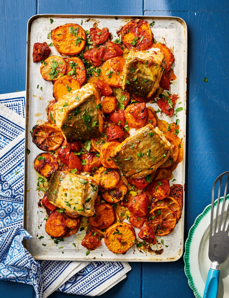 Cod cooks quickly, so it’s the perfect variety of fish to cook in the oven on a tray. This delicious version is cooked with lightly spiced sweet potatoes, lemon, garlic and lots of other flavours, which makes for an all-round perfect dinner.