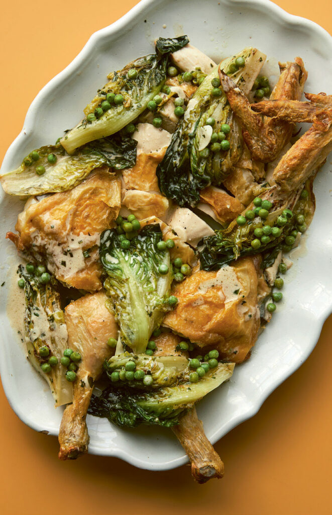 Spatchcocked Chicken with Tarragon-Braised Lettuce and Peas
