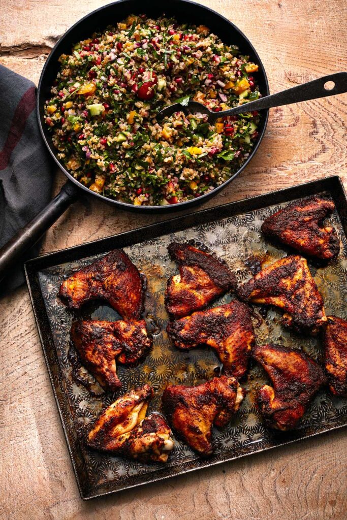 Smoky roasted chicken wings, flavoured with a medley of spices, pair perfectly with this refreshing, veg-packed freekeh salad.