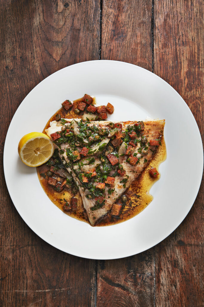 A great option if you’re cooking for a dinner party in the warmer months, this fish dish sees mild and delicate skate topped with lemon and herb browned butter, plus lightly fried capers and croutons for a touch of savoury richness.